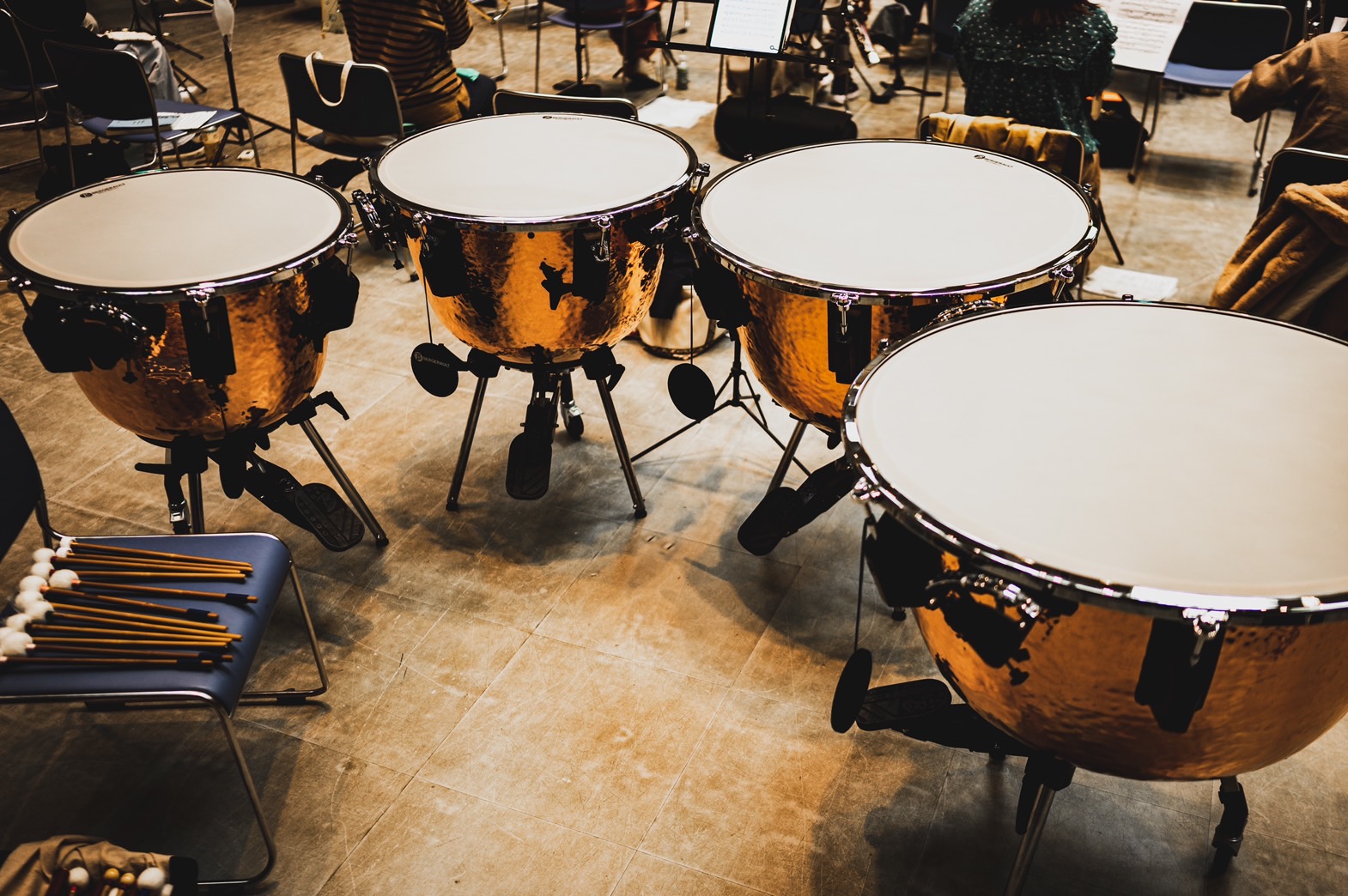 ティンパニやバスドラム、銅鑼(タムタム)などの大型楽器から、鍵盤楽器(シロフォン・グロッケン・チャイム)までオーケストラ・吹奏楽の練習に必要な楽器の他、大量の譜面台や指揮者用の台や椅子・譜面台など、運営に必要な備品を各種取り揃えております。