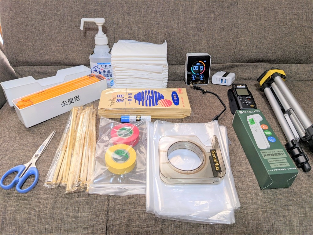 はさみ、鉛筆(約50本)、ICレコーダー、三脚、充電器(USB-C)、非接触体温計、CO2濃度計
